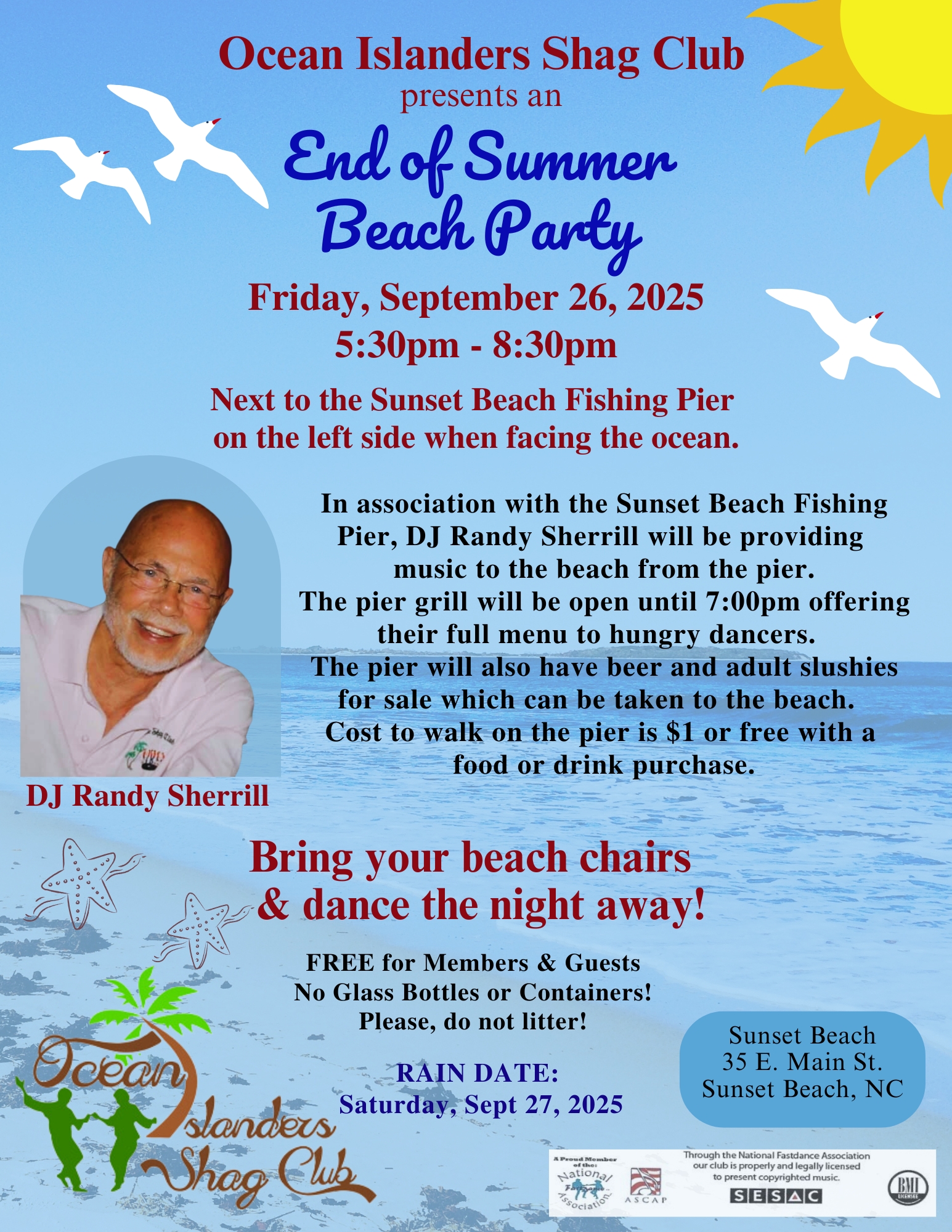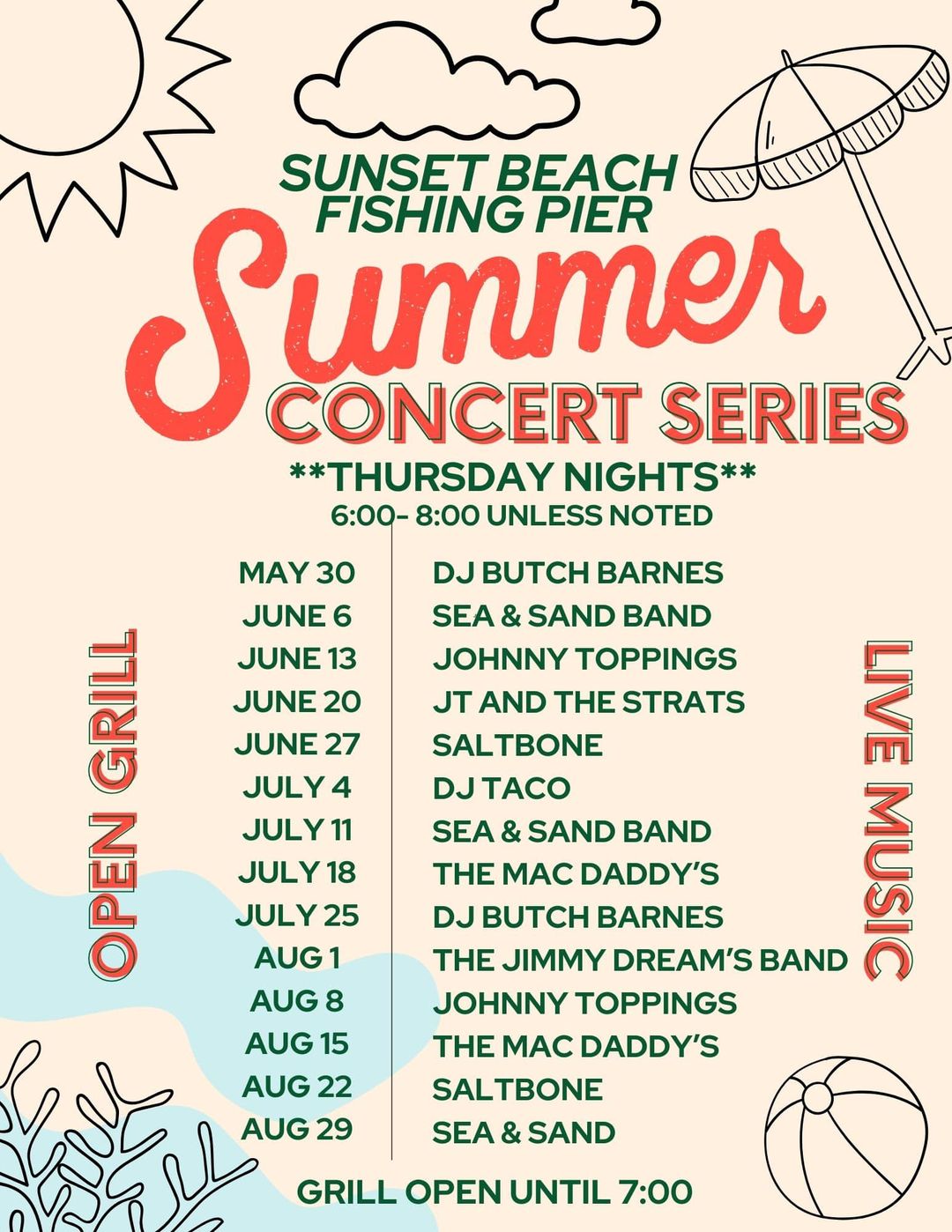 Enjoy LIVE Music at the Pier!Bring your beach chairs and blankets, set up on the beach or sit on the pier ($1pp) and enjoy FREE LIVE MUSIC as the pier becomes a stage! The GRILL will be OPEN until 7pm with a limited menu. We also have plenty of snacks, cold beverages, beer and more on the pier. 2025 Summer Concert Series Thursday Nights from 6pm to 8pm unless otherwise noted. • May 29th-The Mac Daddys • June 5th -Backline • June 12th -Trublmkrz • June 19th -John Toppings - Desperado • June 20th - DJ Beach Party! • June 26th - Sea & Sand Band • July 4th - DJ Taco (Friday) • July 10th - Sea & Sand Band • July 17th - Karaoke/DJ Night! • July 10th- Salt Road • July 31st -John Toppings - Desperado • August 7th-The Mac Daddys • August 14th - Trublmkrz • August 21st -The Mac Daddys • August 28th -Sea & Sand Band• September 26th-End of Summer Beach Party!DetailsThe Sea and Sand Band jams on the pier.